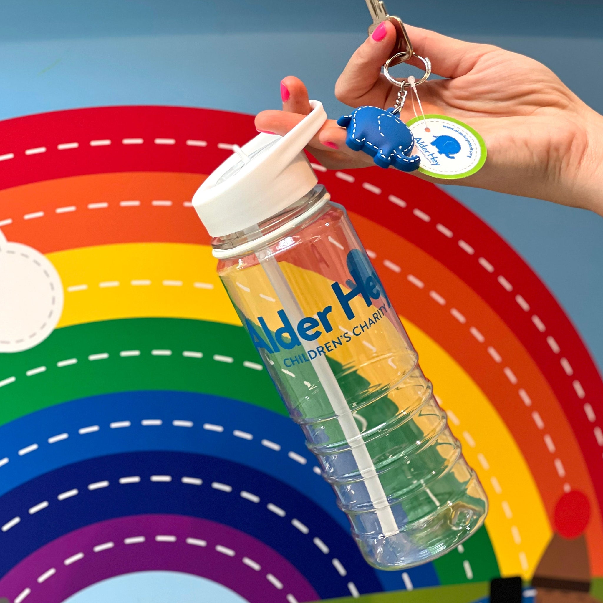 - A 750ml plastic drinks bottle, transparent with white coloured trim and fold down sip mouthpiece. Branded with our charity logo.
